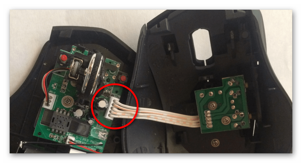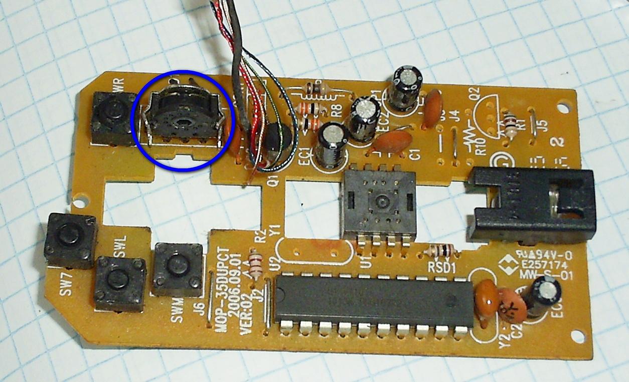 Все, можно возвратить печатную плату на место. Укладываем провод и крепим плату винтами. Следите, чтоб провод не касался подвижных деталей, не был уложен под толкатели кнопок, не был придавлен корпусом. Прежде чем закрыть корпус крышкой, позаботьтесь о том, чтоб лишняя грязь и волосинки были убраны. Можно пользоваться мышкой.