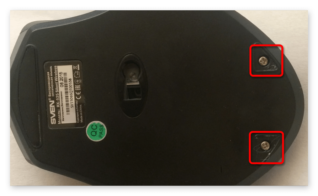 Если первичный осмотр не позволил обнаружить винт на корпусе мышки, он может быть спрятан под наклейкой от производителя. Выявляется это посредством тактильных ощущений — надавите пальцем на наклейку с небольшим усилием и проведите по всей площади. Там, где будет чувствоваться отверстие, расположен искомый шуруп. Чтобы его открутить, нужно аккуратно отклеить этикетку или разорвать с помощью отвертки.