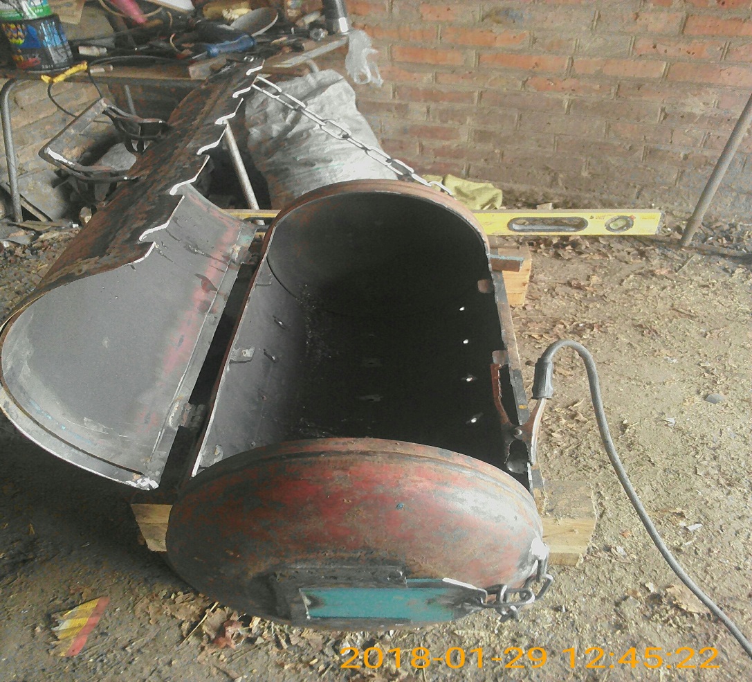 Дымоход. С одного конца баллона мы уже имеем отверстие и теперь точно такое же прорезаем с другого конца, после чего с помощью поворота и трубы диаметром 100мм делаем дымоход. Если хотите, чтобы у вас был не просто мангал, а так называемый мангал коптильня барбекю из газового баллона, то на дымоход нужно установить еще одну подобную баллону емкость, оборудованную дверкой. В этом месте можно будет производить горячее копчение практически любых продуктов питания.