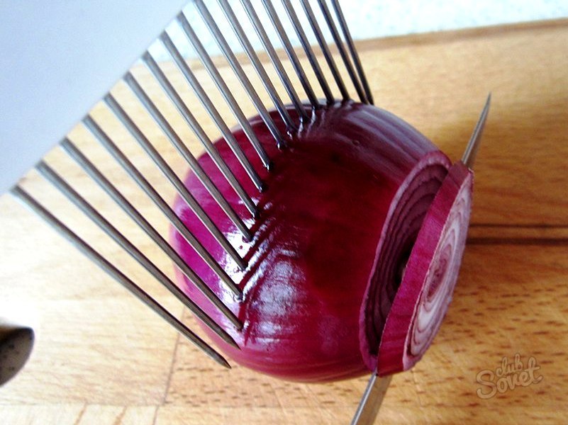 Для облегчения овощной нарезки кольцами можно применить специальные держатели, которые не только удержат луковицу металлическими зубцами, но и обезопасят пальцы. Наденьте приспособление на очищенную головку и нарезайте острым ножом поперек. Кольца получаются очень тонкие и равномерные.