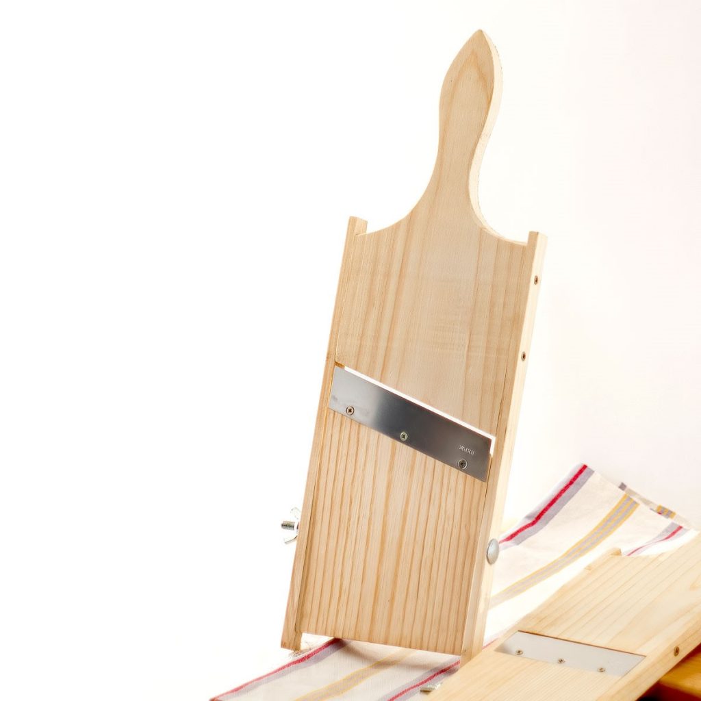 Такой нож для рубки капусты применяли с древних времён, к нему изготавливали ещё деревянное корытце, в котором и выполнялась рубка овоща. Он оснащён закругленным стальным лезвием и деревянной ручкой. Пользоваться таким прибором неудобно.
