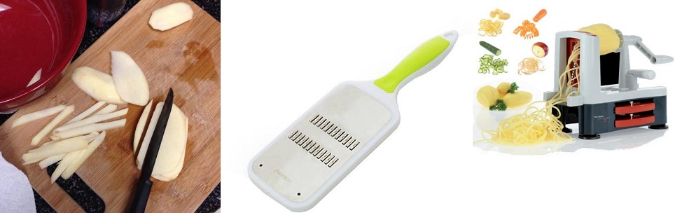 - Также сейчас в продаже представлено много экземпляров кухонных приборов, которые могут вырезать спиралью, делать различные выемки. А специальные гофрированные ножи быстрее придадут кусочкам нужную фигурную форму.