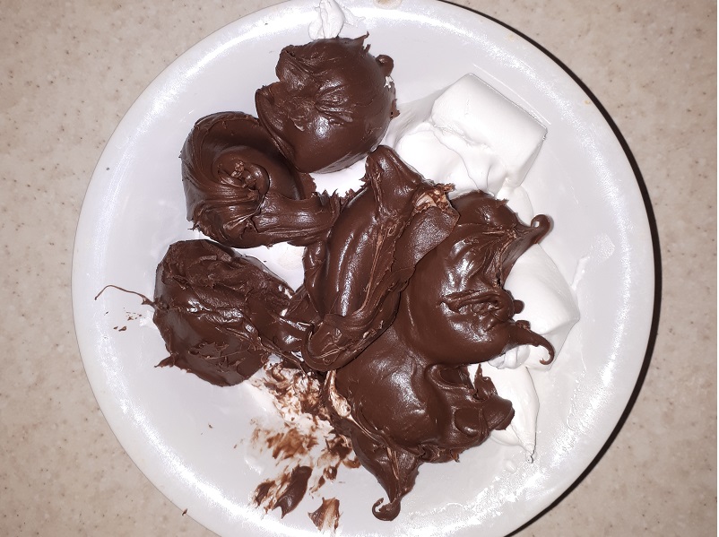 Если вы не знаете, как приготовить слайм, который можно кушать – запаситесь шоколадной пастой и Маршмэллоу. Для этого отлично подходит Nutella и суфле «Тучки-Штучки». Рецепт выполняется в два этапа. Вначале необходимо растопить зефирки. Для этого ставим 30 штучек в микроволновую печь и разогреваем около 60 секунд – этого хватит. Теперь они похожи на пену для бритья, и необходимо добавить загуститель. В этом случае его роль выполняет шоколадная паста. Добавляем в миску с суфле Nutella с расчётом, что на каждую столовую ложку приходится 3 зефирки