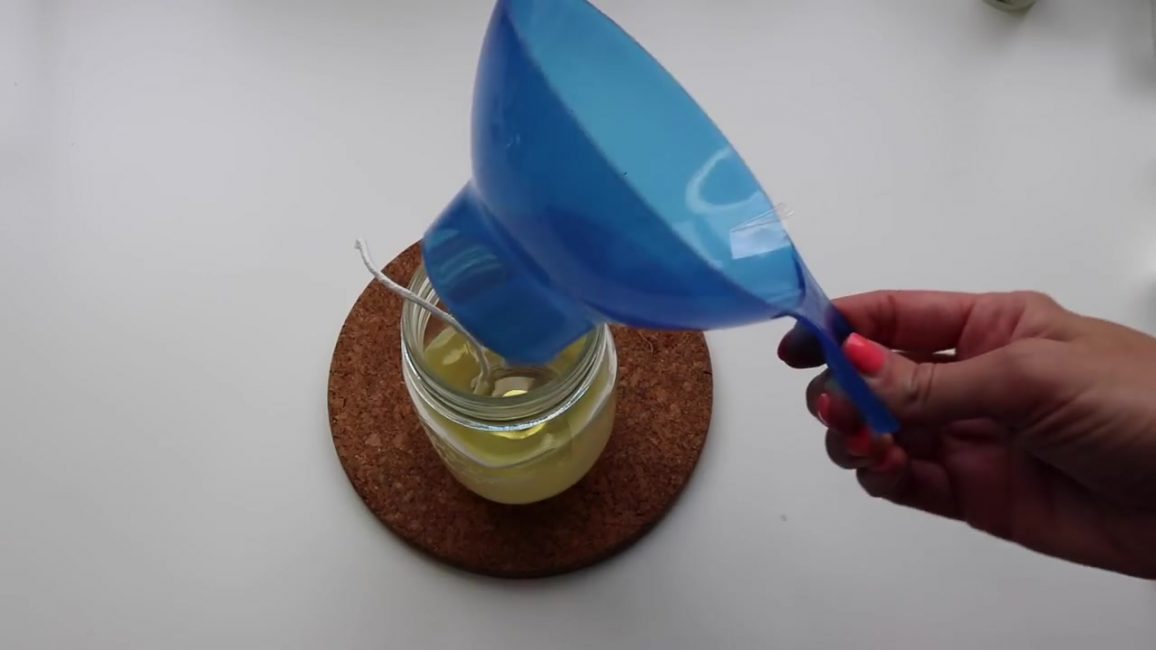 4. Налейте растопленный соевый воск в баночку. Старайтесь, чтобы фитиль был прямым, для этого можно его прижать палочками или зубочистками.