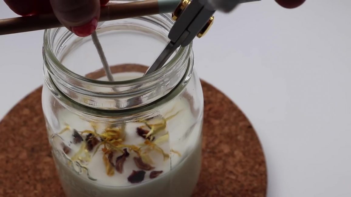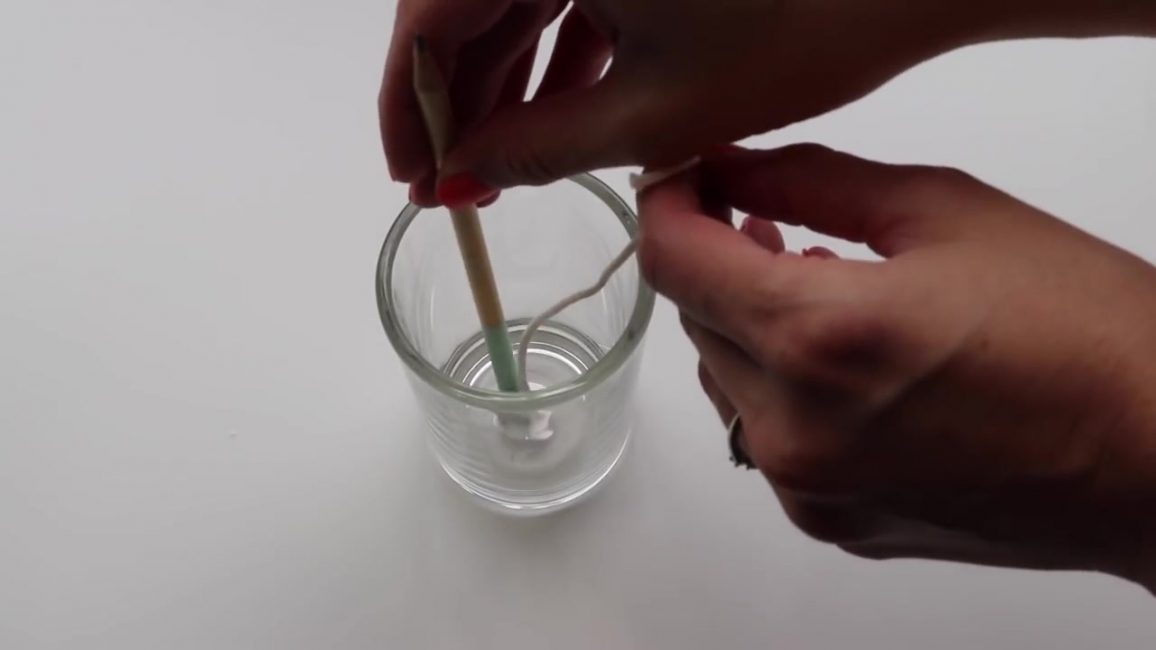 Фитиль, прикрепленный к дну, может сначала немного качаться в жидком воске. Вы точно хотите, чтобы он оставался ровным, находился по центре, пока все будет застывать. Просто положите ручку на верх формы, привяжите к ней фитиль, оставьте застывать на несколько часов.