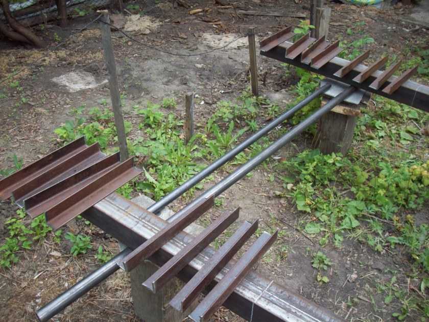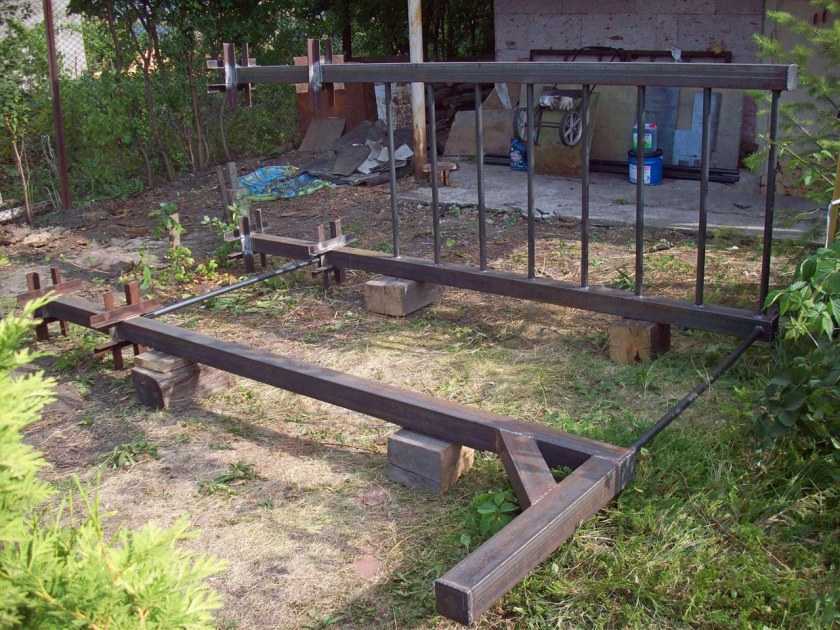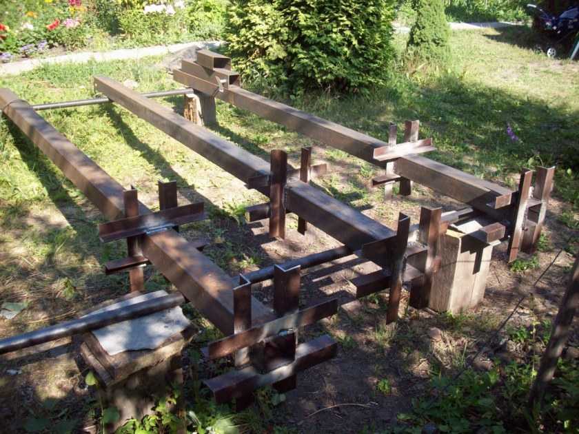 - Через сутки приваривают перекладины, проверяют горизонталь по уровню, ширина между трубами должна быть в пределах 0,5 метра;