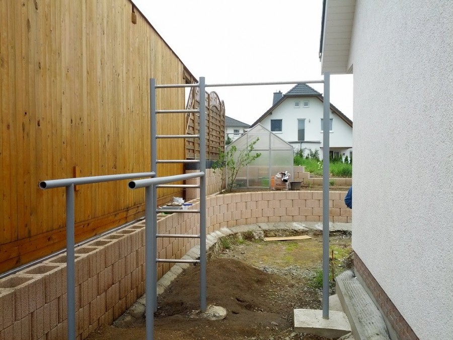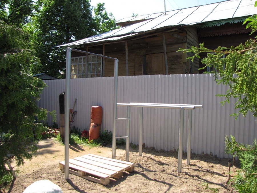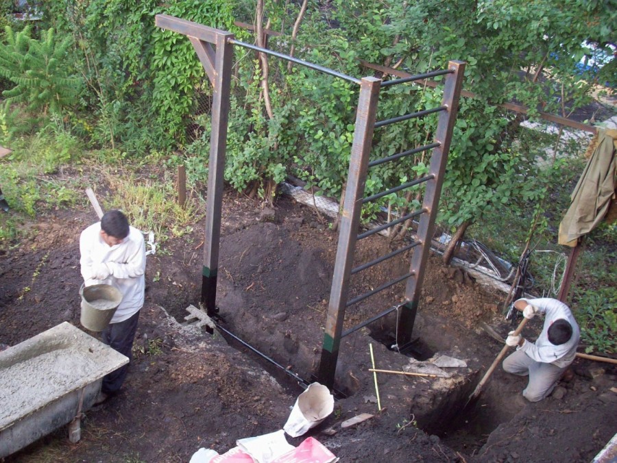 Для создания тренажера потребуется цемент, емкость, мастерок, лопата, сварочный агрегат, строительный уровень, бур на 20 см. Перекладины делают из труб диаметром 40 миллиметров, стойки — из аналогов сечением 60 мм. Во втором случае подойдут заготовки с прямоугольной конфигурацией. Запас по высоте берется порядка 600 миллиметров.