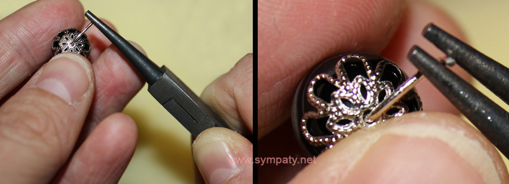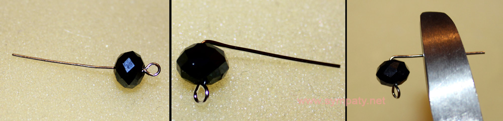 Берём второй штифт и гранёную бусину. Надеваем бусину на штифт и проделываем то же самое, что с предыдущим штифтом. Загибаем под прямым углом, отмеряем нужную длину хвостика, отрезаем лишнее…