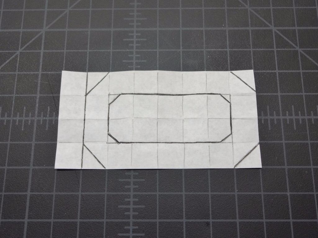 Шаблон создается путем создания сетки 4 x 8 на листе бумаги, где 4 блока соответствуют общей ширине вашей квадратной заготовки (поэтому для меня каждый квадрат равен 1/2 «на 1/2»).