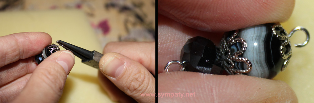 Осталось присоединить к сережке швензу. Разомкните немного кольцо на швензе, соедините её с верхом первого элемента и снова сомкните.