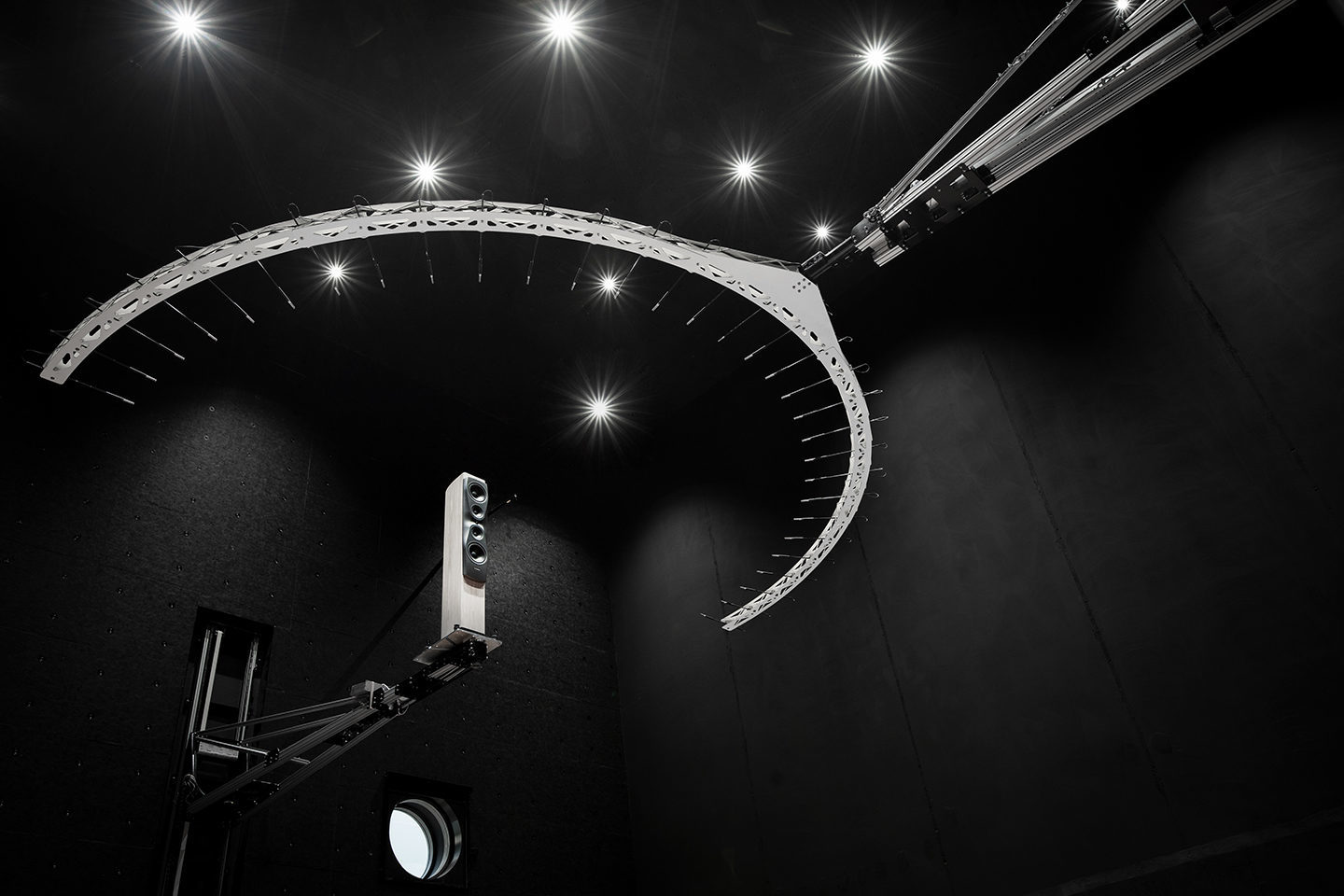 Собственно говоря, что же представляет этот засекреченный «Юпитер»? Все новое здание для отдела разработок построено вокруг одного большого бетонного куба с внутренними размерами 14х14х14 метров. Этот объем построен для того, чтобы расположить измерительный стенд — две моторизованные управляемые системы, одна поднимает на нужную высоту исследуемую акустику, а другая представляет собой подвижный полукруг, с 31 измерительным микрофоном. Эту микрофонную сборку можно сдвигать выше или ниже и поворачивать. И в таких условиях производить замеры акустики. Система позволяет быстро и качественно получать большой объем информации, измеряя прототип, или отдельный динамик в нужных условиях. Показать это все я могу без подробностей, только на официально полученных фотографиях.