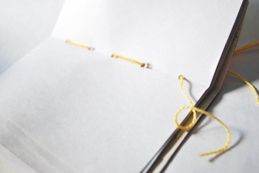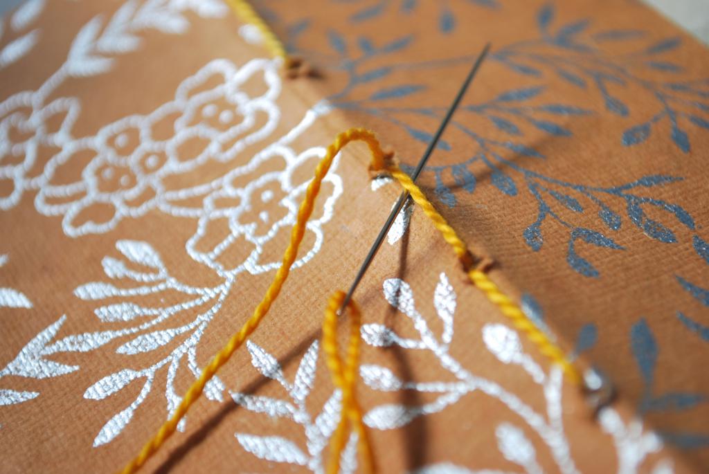 Для шитья можно использовать нитки для вышивания минимум в два сложения – они достаточно плотные и не рвутся в процессе работы. Такие нитки легко найти, а еще можно выбрать любой понравившийся цвет. Тут также желательно использование груза. Так все будет ровно, тетради не будут сбиваться. Каждые две сшитые тетради нужно закреплять узлом, лента оплетается снаружи. Последнюю тетрадь тоже нужно закрепить крепким узлом.