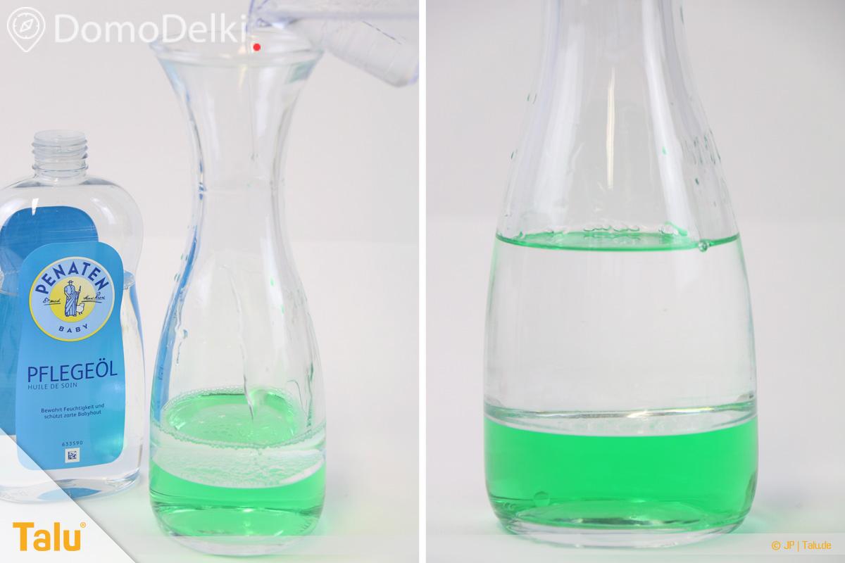 Шаг 3: Затем добавьте прозрачное детское масло. Должно быть так, чтобы слой воды был меньше, а слой масла достигал как минимум вдвое больше. Конечно, это можно узнать только тогда, когда масло медленно оседает над водой. Так что подождите немного, чтобы иметь возможность оценить точное количество наполнения или измерить все с помощью мерного стакана. После добавления масла подождите, пока масло полностью не осядет поверх окрашенной воды.