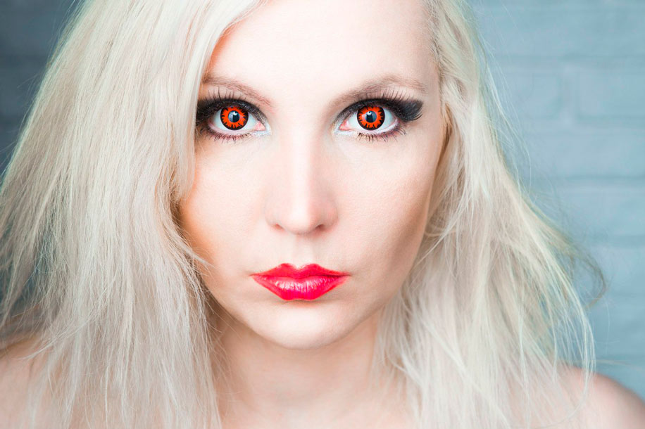 - Карнавальные линзы используют при создании эпатажных образов: для косплея и карнавалов, креативных фотосессий, посещения дискотеки. Модели такого типа выпускаются в ярких цветах — розовом, желтом, синем, белом и т.д., а на область радужки у них часто нанесен необычный принт. Это может быть изображение звезды, пламени, глаза животного и пр. В данной категории оптическую силу до – 10D имеют только Adria Neon от Interojo. Они к тому же могут светиться в темноте при попадании на них лучей ультрафиолета. Эти линзы называются еще клубными, так как молодежь использует их для походов на дискотеки. Все остальные crazy-линзы выпускаются без диоптрий и предназначены исключительно для создания визуального эффекта.