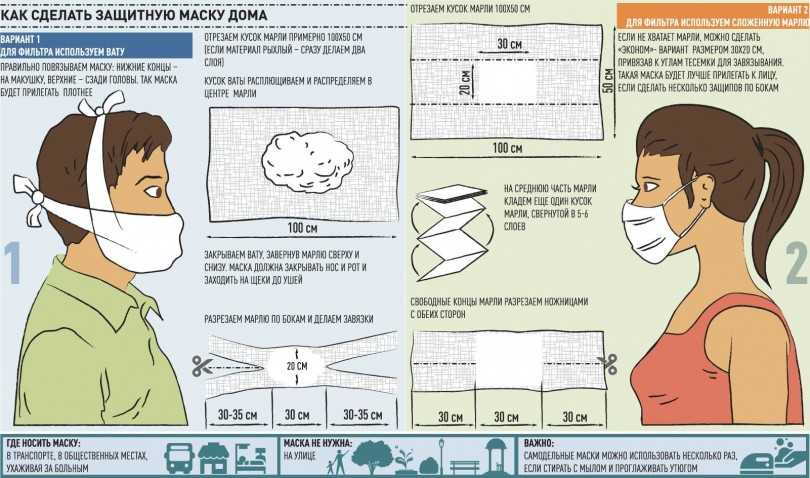 Основное преимущество марлевых повязок — их можно быстро скроить и использовать несколько раз, так как они способны выдержать до 20 стирок без потери качества. В качестве аналога марли можно взять широкий бинт, не менее 14 см, чтобы он полностью закрывал органы дыхания.