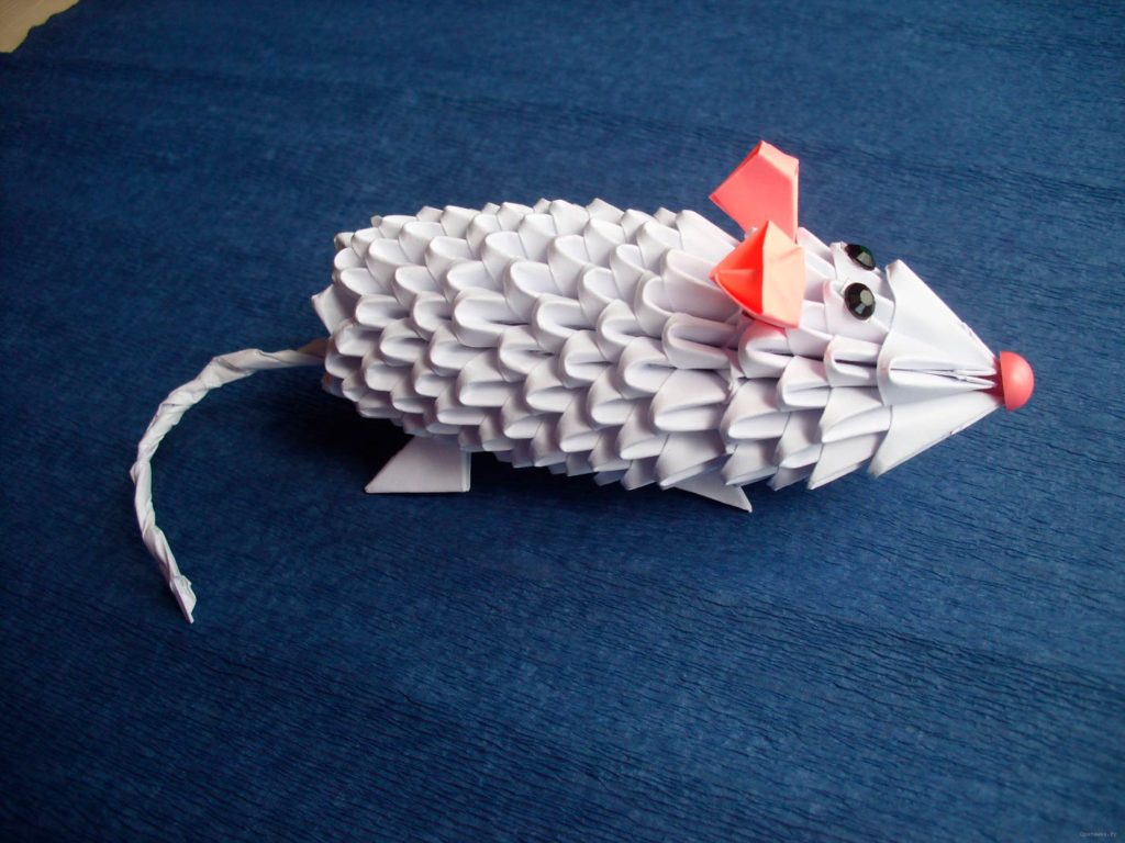 Чтобы модульная фигурка была устойчивой, нужно внизу туловища прикрепить еще 2-ва или 4-е модуля. Они станут лапками животного. Хвостик сделать из мятой полоски бумаги. Используя такой алгоритм можно сделать даже крысу. Для этого черты мордочки нужно сделать более продолговатыми. Остальные черты крысы можно получить благодаря другому типу отделки.