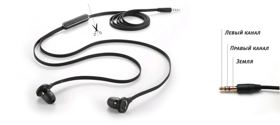Кабель для наушников может быть разным – плоским, круглым, одинарным или двойным. В некоторых моделях он подключается только к одному динамику, в других – к обоим. В кабеле и есть набор «живых» проводов с оголенным заземлением. Провода покрашены в условные цвета, чтобы нельзя было перепутать вход для подключения.