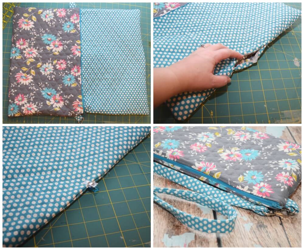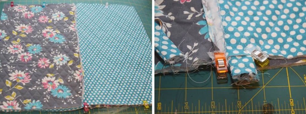 Вам необходимо положить основную ткань лицевой стороной вниз. Затем накрыть ее синтепоном или ватином, а сверху покрыть второй деталью из ткани, положив ее лицевой стороной вверх. Скрепите все три слоя по периметру булавками. Поскольку полоска наполнителя немного меньше материала и подкладки, скрепите там, где они еще соединены. Затем прострочите на машинке по периметру со стороны, с которой вам удобнее работать.