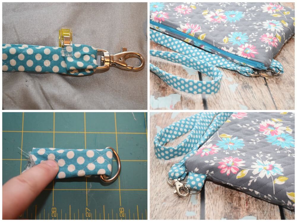Сделайте еще два маленьких ремешка для скоб по такому же принципу. По концам ремня прикрепите застежки, предварительно продев их в отверстие. Точно так же проденьте ремешок в скобу, а затем подверните края и пришейте с двух сторон сумки. У вас должен получиться съемный ремень, которым будет удобно пользоваться.