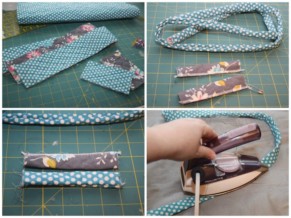 Выверните подготовленную для пошива ремешка ткань пополам, если вы планировали сделать двойной слой, изнанкой наружу. Затем скрепите ее по длине булавками, после чего прострочите на машинке и выверните. Если приняли решение сделать четыре слоя, разложите прямоугольник изнанкой вверх, затем сложите по ширине так, чтобы две стороны соединились посередине. Проложите строчку по обоим краям.
