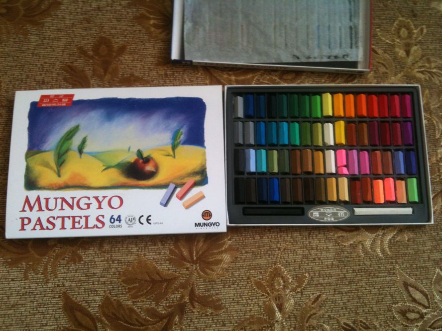 — пастель, у меня «Mungyo», китайская_))) мягкая и яркая, я ее дизайнерским ножом крошу в мисочку, откуда набираю мягкой кистью и наношу на лицо куклы (иногда работаю ватными палочками — зависит от настроения) 64 цвета — 500-600 р.;