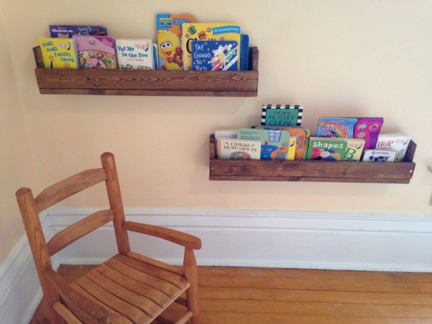 Простейшие полки на стену, предназначенные для книг и всякой мелочевки, представляют собой прямоугольный ящик, собранный своими руками из досок либо ламинированного ДСП. Последний вариант удобен во всех отношениях – поверхность не нужно обрабатывать, только подогнать размеры и оклеить торцы шпоном под цвет ламинированного слоя.