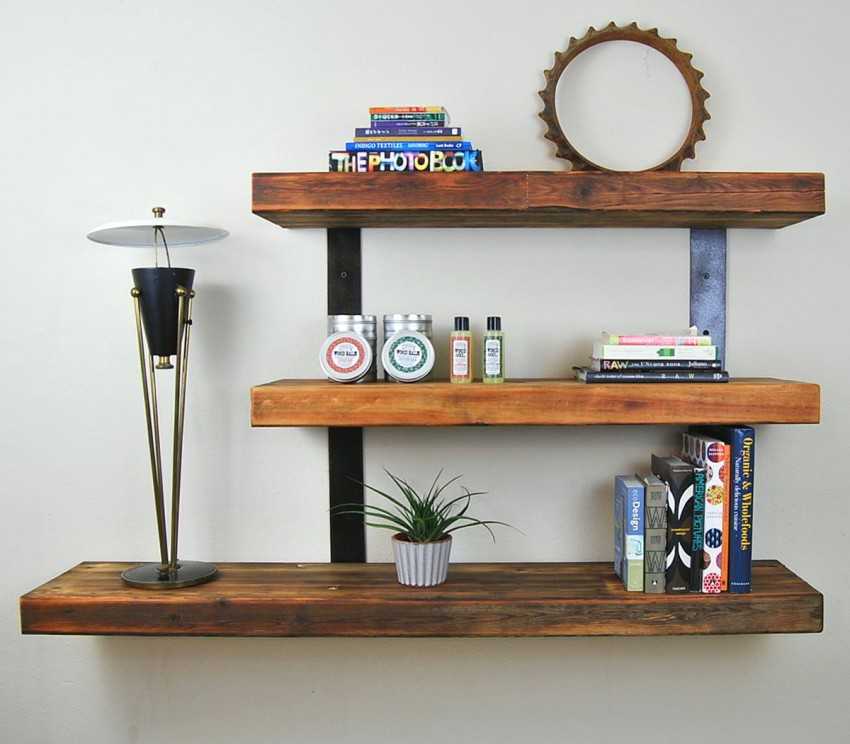 Даже если это очевидная основа, ее не следует сразу отбрасывать. Разнообразить деревянную настенную полку помогут сложные формы и крепление. Для минимализма или лофта такое решение будет весьма уместным. А если вы хотите вписать элемент в классический интерьер, рекомендуется предварительно обработать детали, а может даже и украсить резьбой.