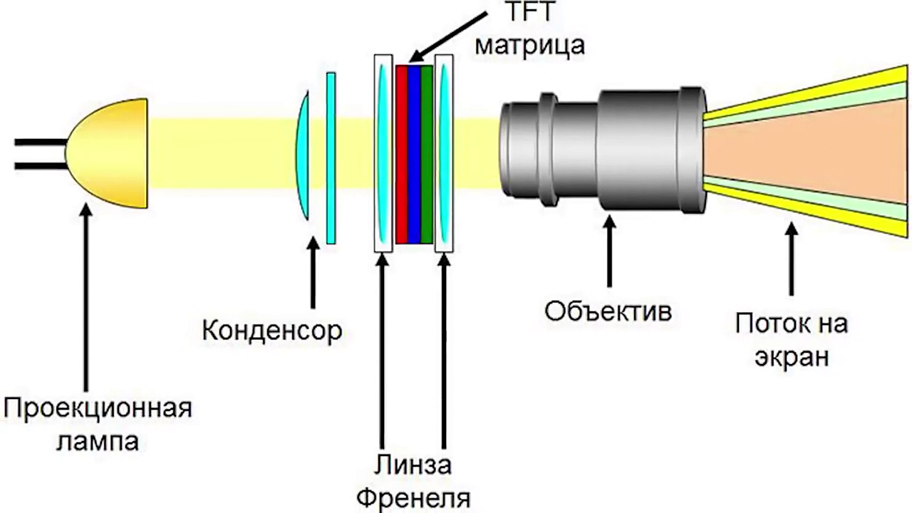 В основе проектора, как и всевозможных слайдеров, фильмоскопов, законы оптики: когда носитель изображения взаимодействует со световыми потоками, лучи преломляются, картинка увеличивается, транслируется на экран.