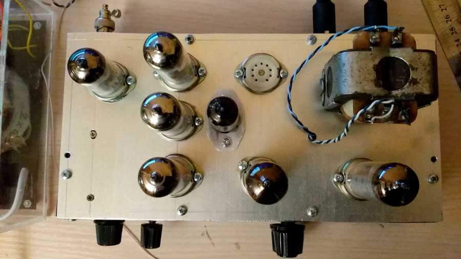Конструктивно приемник выполнен навесным монтажом внутри сборной алюминиевой коробки размером 50 х 120 х 240 мм. Крышка изготовлена из алюминия толщиной 2,5 мм, стенки и дно — из алюминия толщиной 1 мм. Дном можно пренебречь, но это несколько ухудшит стабильность работы приемника. На крышке расположены восемь панелек для ламп (одна из них осталась незадействованной), также на ней закреплен трансформатор УЗЧ и переменный конденсатор.