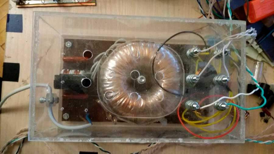 Блок питания выполнен в отдельном корпусе, но такое исполнение не принципиально. Правильнее было бы немного увеличить размеры девайса и смонтировать блок питания в одном корпусе с ним (трансформатора на 100 Вт хватит с избытком). Впрочем, это можно рассматривать как фичу: в двадцатых годах прошлого века блоки питания тоже часто делали отдельными.