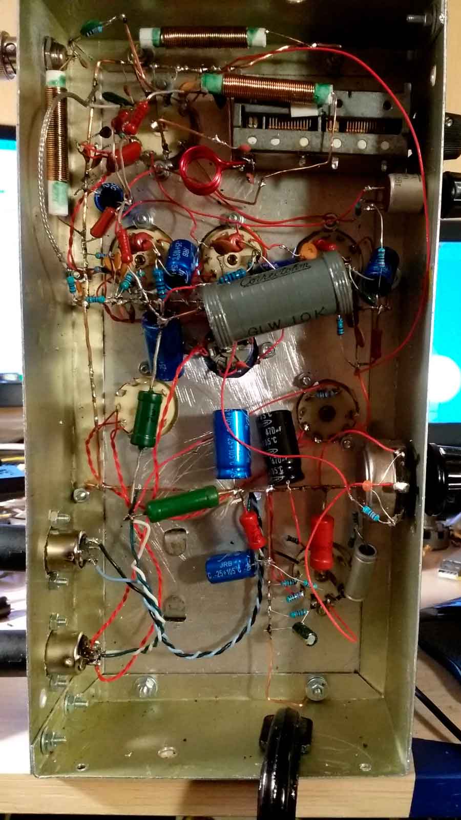 FM-радиоприемник на лампах. Вид снизу. На передней стенке закреплены резисторы регулировки громкости и режима работы смесителя, туда же выведена ручка переменного конденсатора.