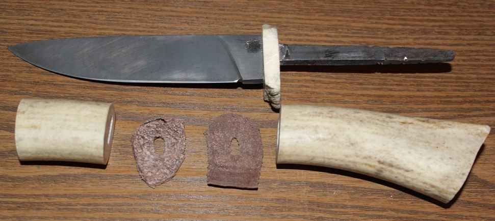 Перед тем, как выполнять работу, можно потренироваться в черновой сборке деталей. После завершения сборки следует обработать рукоять при помощи резака и наждачки. Половинки должны быть прикреплены симметрично. Также нужно пропитать деревянные половинки по стороне, прилегающей к хвостовику, эпоксидным клеем или смолой, добавить тонер, чтобы придать необходимый оттенок изделию. Далее нужно обмотать скотчем клинок ножа и соединить заготовку, куски прута, выступающие заклепки срезать. Готовый нож снова зажать в тиски, предварительно замотав ручку в промасленную резину. Дать готовому изделию высохнуть (сутки-двое).