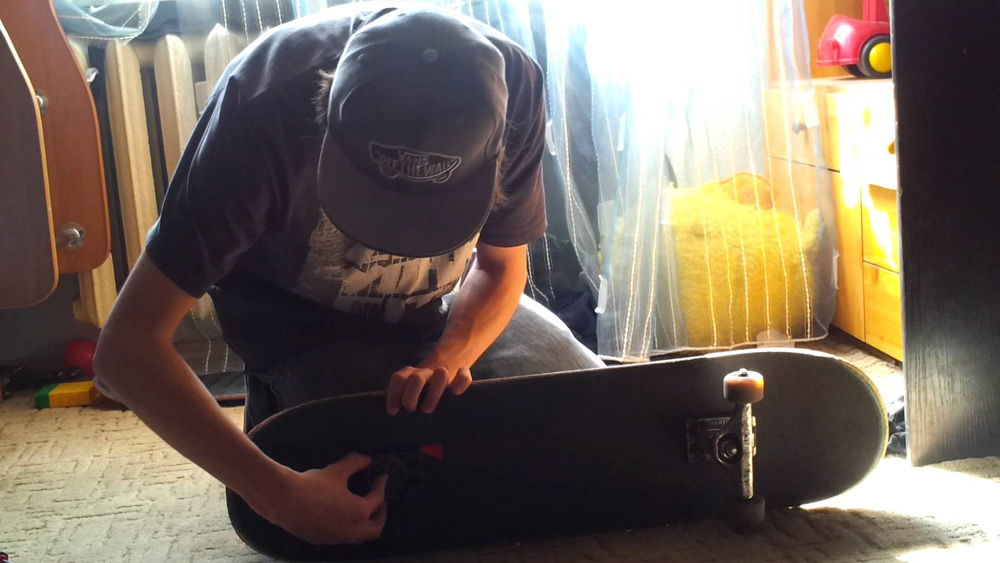 Поскольку заводская шкурка отсутствует, то в качестве замены можно взять обычную наждачную бумагу. Процесс её приклеивания аналогичен тому, что был описан в случае с заводским материалом. В этом случае также нужно избавиться от пузырьков с воздухом. Заводским подвескам и подшипникам найти такую же достойную замену, как и шкурке, не получится. Поэтому не заморачиваемся с попытками самостоятельно изготовить эти детали в домашних условиях, а лучше сразу выбираем заводские детали и продолжаем собирать свою идеальную доску. Чаще всего для самостоятельной сборки выбираются детали типа 608. Также придётся купить рейзеры, лучшие из которых производятся из полиуретана или резины.