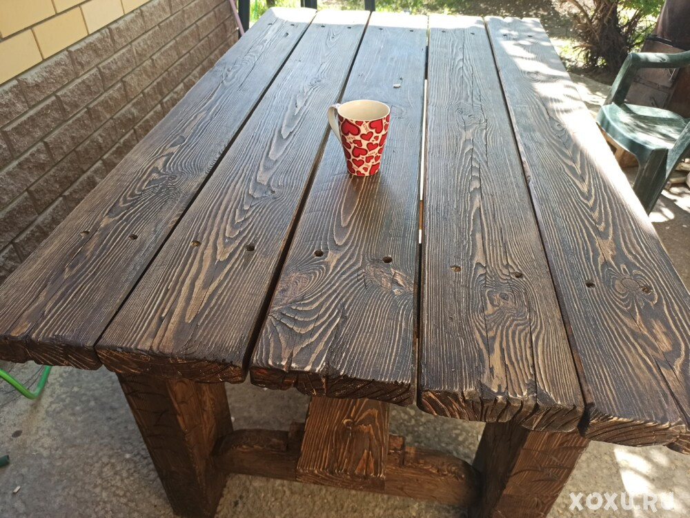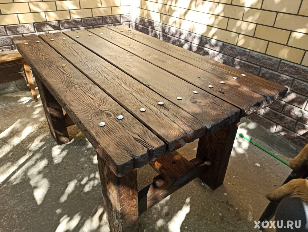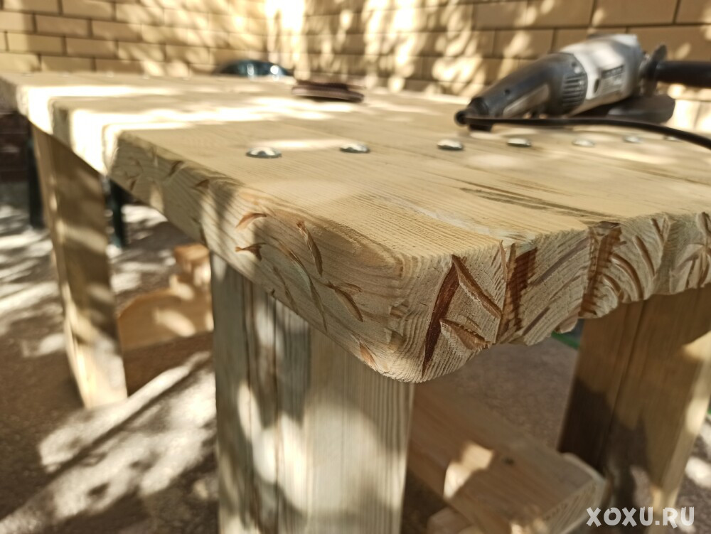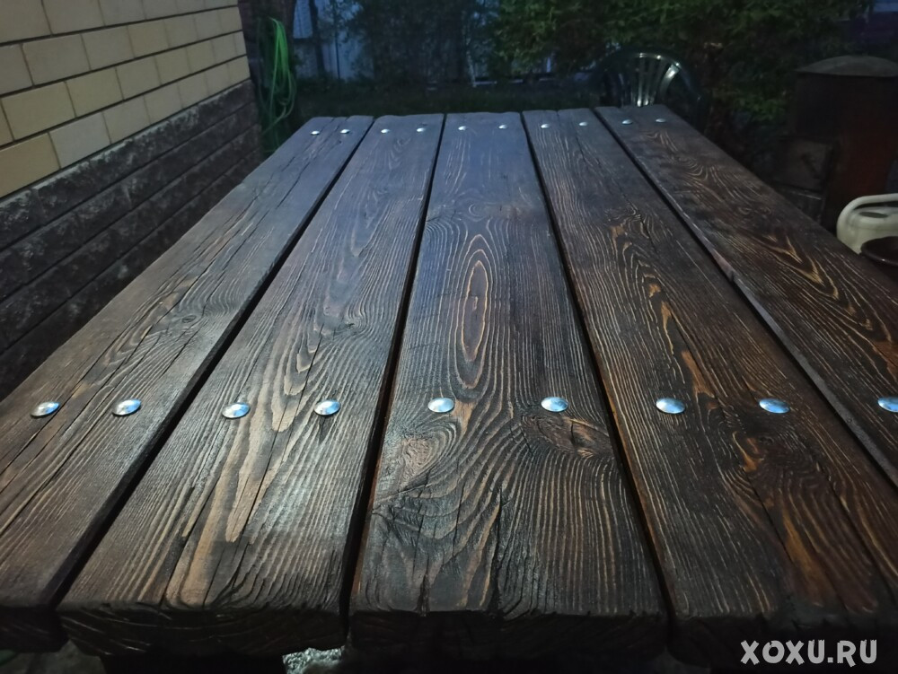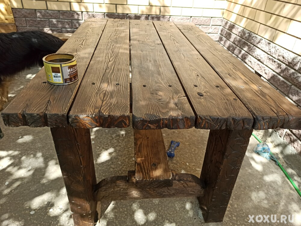 Вот такой столик получился. Опять же, можно было закончить… Но нет! Стол ведь будет находиться под открытым небом во дворе, поэтому нужно его защищать специальным маслом. Если покрыть только морилкой или пропиткой – то она выгорает на солнце, а дерево защищено толком не будет. Срок жизни будет минимальным, и такой стол быстро потеряет вид. Поэтому, если взялись делать, то нужно до конца идти…