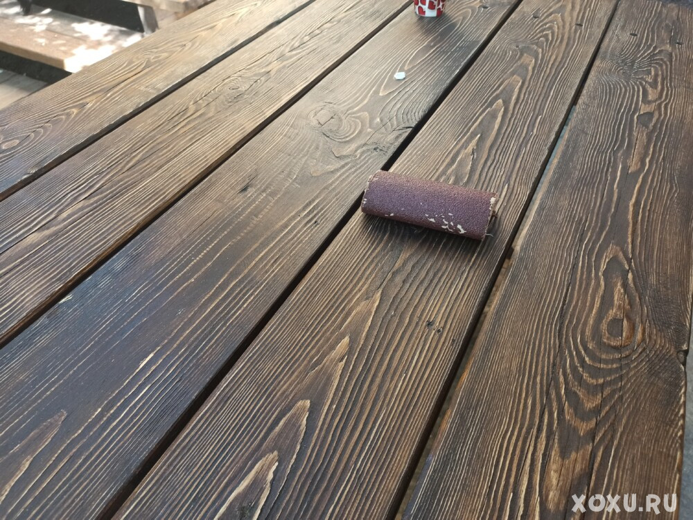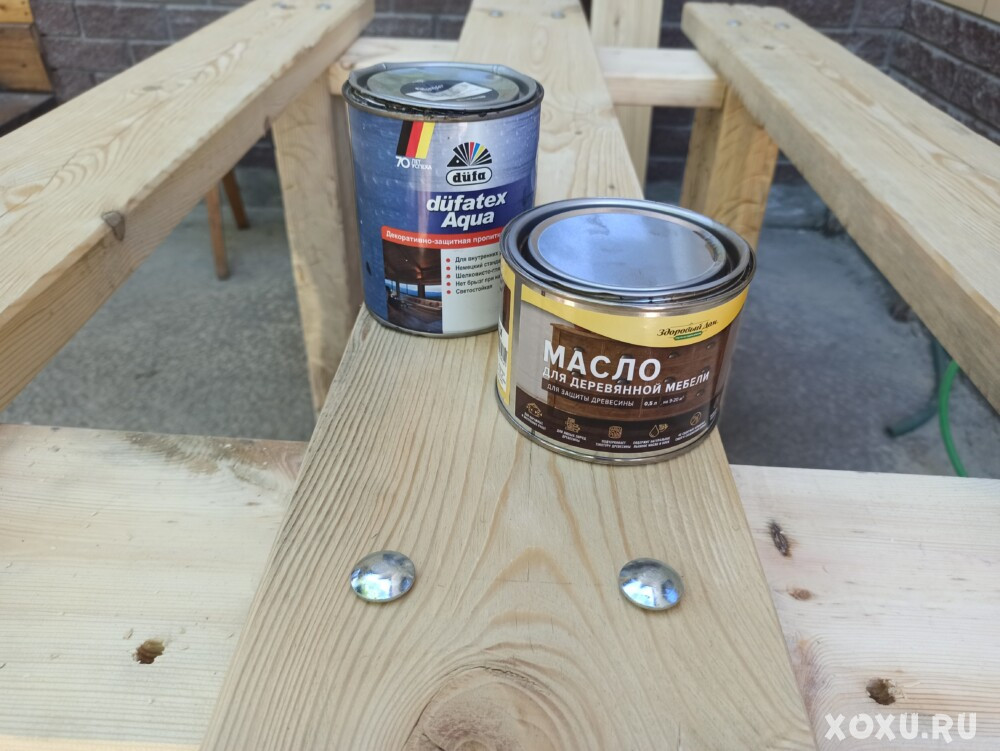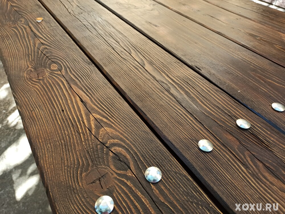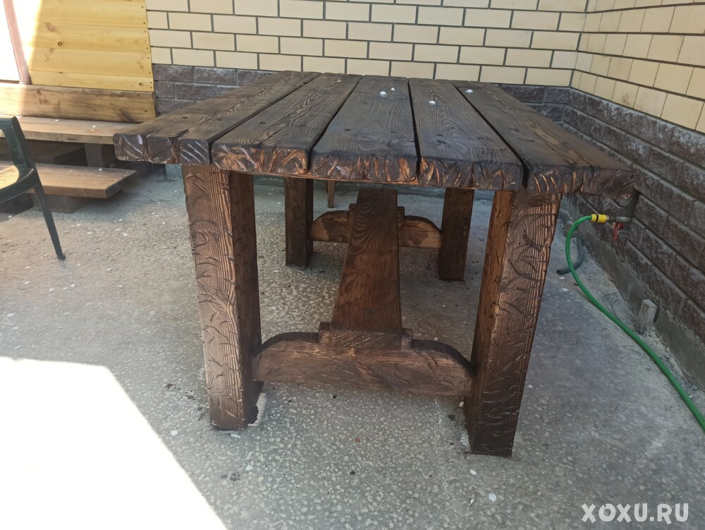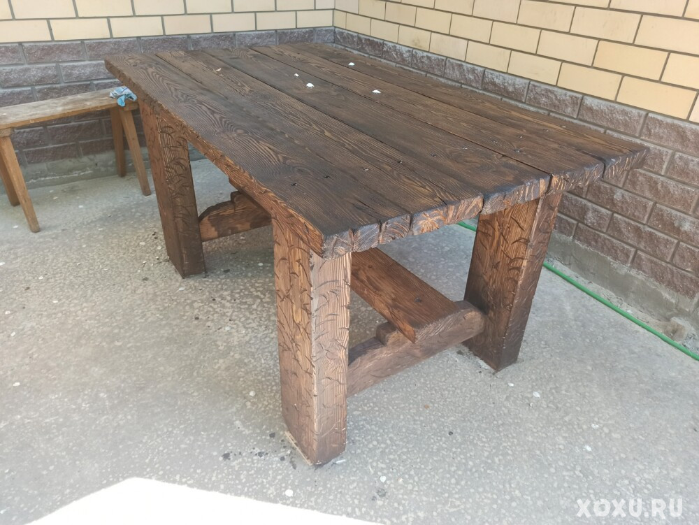 Вот такой столик получился. Опять же, можно было закончить… Но нет! Стол ведь будет находиться под открытым небом во дворе, поэтому нужно его защищать специальным маслом. Если покрыть только морилкой или пропиткой – то она выгорает на солнце, а дерево защищено толком не будет. Срок жизни будет минимальным, и такой стол быстро потеряет вид. Поэтому, если взялись делать, то нужно до конца идти…