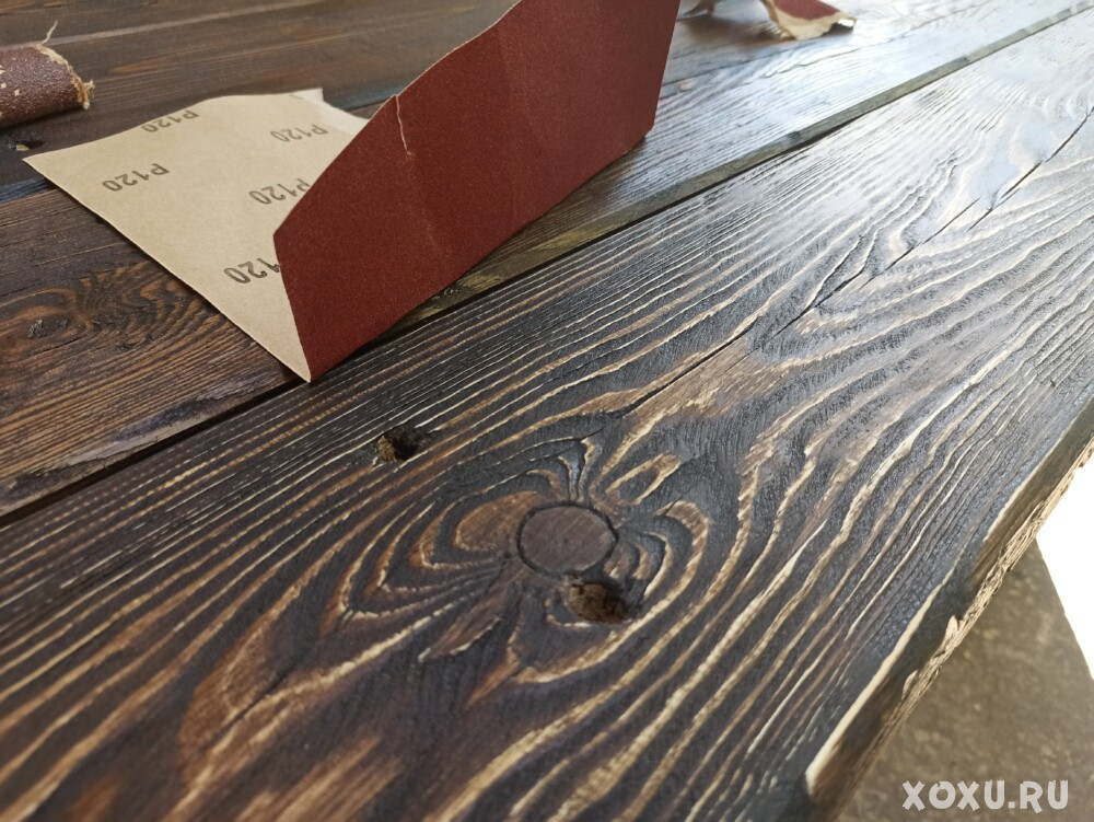 Дождались 5 часов (а лучше сутки), после высыхания пропитки – самое время сформировать те самые узоры. Узоры после покраски просто так не появляются. Мы наоборот, сначала покрасили стол, затем он высох, и после этого используем наждачную бумагу, и легкими движениями водим по верхней части столешницы, снимая верхний слой.
