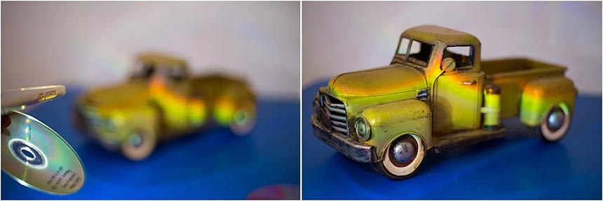Отражение света от записанной поверхности компакт диска создаст радужный отблеск. Используйте это, чтобы создать интересный радужный эффект на вашем объекте съемки или фоне. Наклоняйте диск, чтобы получить различные эффекты.