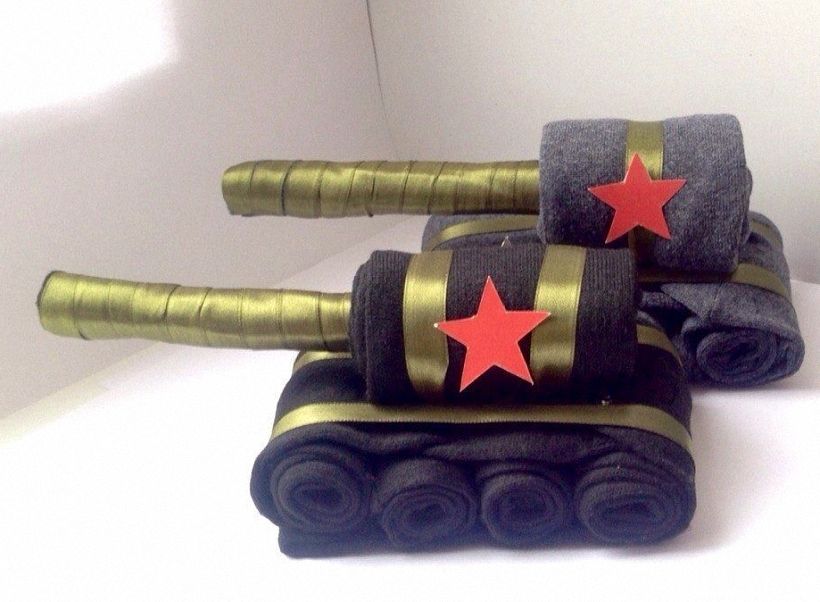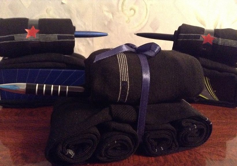 Второй носок станет верхней частью нашего танка, а в него вставим дуло, которым станет ручка. Для того чтобы танк был больше, стоит просто увеличить количество носков. Такой подарок будет по вкусу любому мужчине.