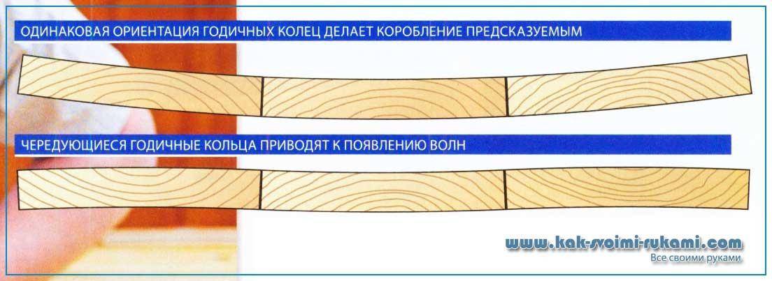 Объяснить это можно так: при сушке доски её годичные кольца, видимые на торцах, стремятся выпрямиться. У рядовых досок линии годичных колен напоминают округлые холмы, и когда эти холмы становятся плоскими, края доски поднимаются, вызывая коробление.