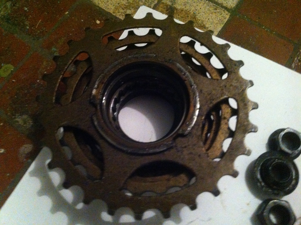 Отличие только в том, что несколько маленьких звездочек могут надеваться на трещотку независимо, и между ними должны находится шайбы — прокладки. Эти звездочки и шайбы надо аккуратно снять так, чтобы они не рассыпались при разборке. Лучше их снимать по одной, и аккуратно где-нибудь раскладывать, чтобы не перепутать при сборке.