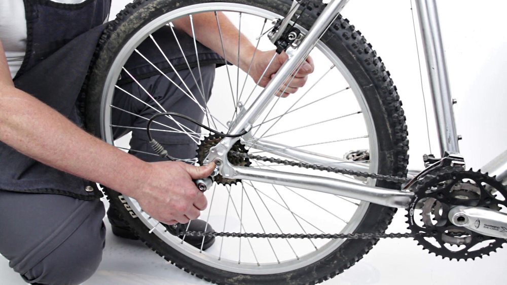 До того как приступать к процессу демонтажа трещотки, требуется снять заднее колесо с байка.