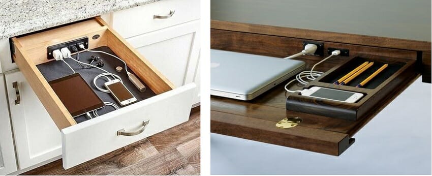 Шнуры можно убрать со стола, применив следующую конструкцию. Так их не будете видно, и в любой момент при надобности вы можете воспользоваться ними.
