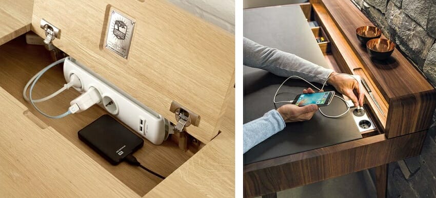 На этапе разработки проекта можно предусмотреть специальные ниши и секции, где будут крепиться блоки питания на нужное количество розеток. Также там можно оставить место, куда можно будет «втянуть» аккуратно свернутые провода, чтобы они не болтались по стене и полу. Ведь на стадии замеров уже понятно и место размещения стола (или тумбы под телевизор), и положение розеток.