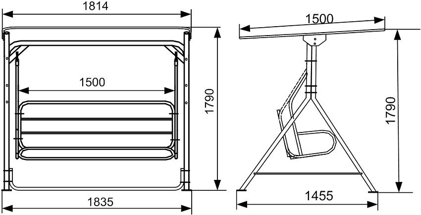 - Навес. Защищает пользователей и подушки на посадочном месте от солнца и дождя. Наиболее популярная форма — односкатная с наклоном назад 10°. Если качели не убираются на зиму, его делают двускатным. Состоит навес из каркаса с натянутым полотном или жестким покровом.