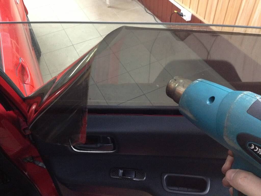 Для данного способа лучше всего подойдет промышленный фен. Нагрейте им стекло до температуры 60 градусов. Таким образом, тонирование отойдет вместе с клеем. Когда тонировку нужно убрать с боковых частей, немного опустите окно. При нагревании потихоньку тяните пленочку вниз.