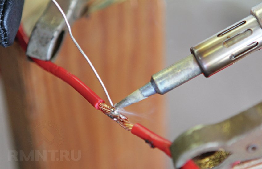 Чтобы залудить такие провода, необходимо с помощью припоя и канифоли тщательно пройтись по месту пайки.