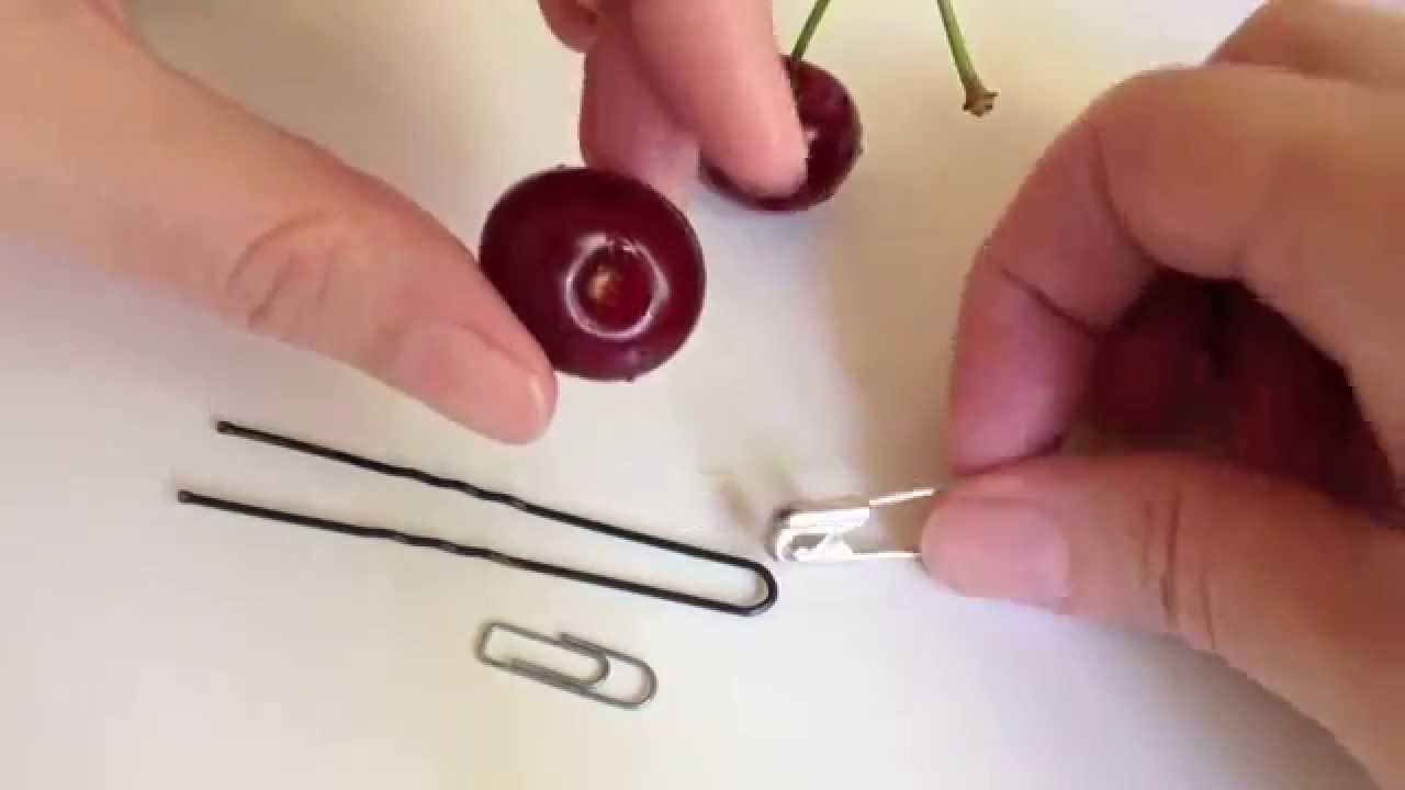 Затем берете ягодку вишни и вводите скрепку одним концом в дырочку, оставшуюся от плодоножки. Нащупываете косточку, цепляете за нее и вытаскиваете.