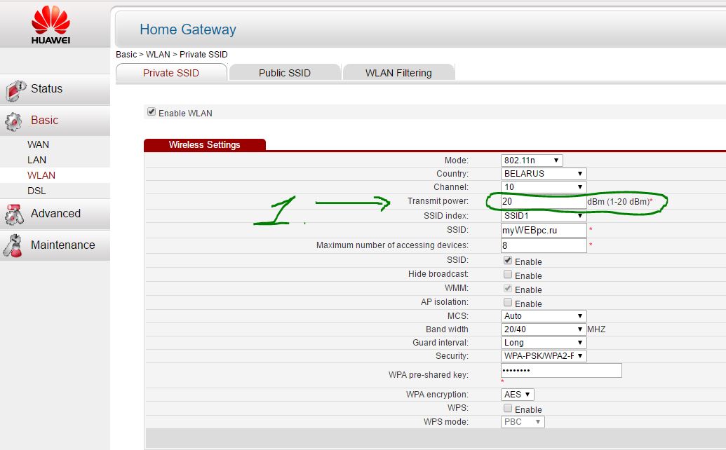 Выберите новый стандарт 802.11 N в настройках модема, если поддерживает. 802.11 N предлагает гораздо больший радиус действия и силу сигнала по сопоставлению с устройствами стандартов 802.11 a/b/г. (Настройка модема HG532e huawei со скрытыми функциями. Чтобы появилась функция смены вещания 802.11N, нужно войти с правами супер админа.)