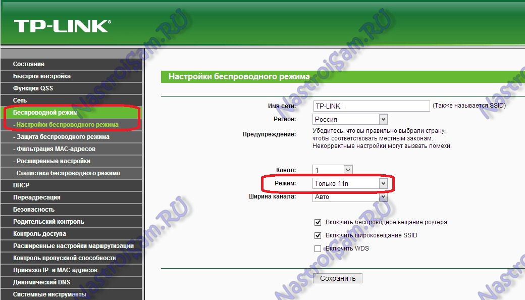 А вот так режим 802.11n выставляется на TP-Link: