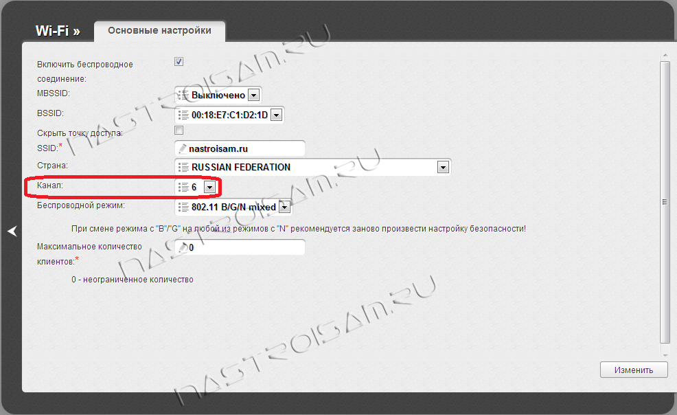 - Откройте раздел «Беспроводной режим», и установите канал аналогичный тому, что указан в настройках главного маршрутизатора.